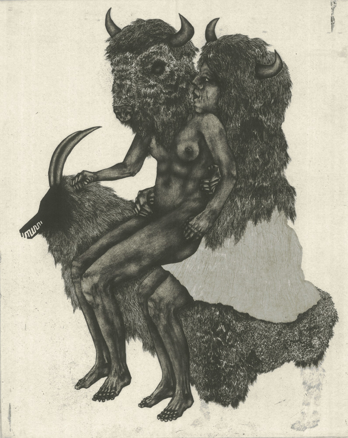 According to her website, it combines etching, aquatint, drypoint and soft ground, and printed on Japanese paper.