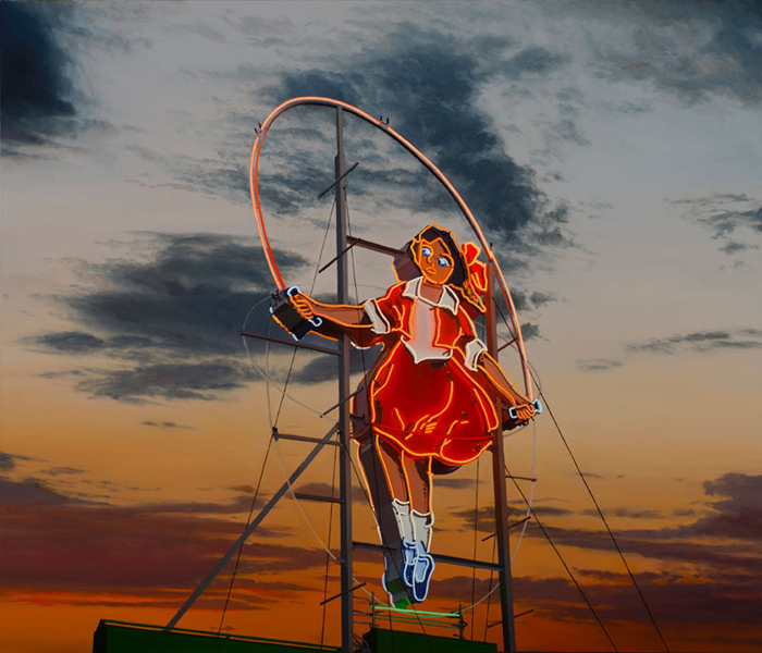Roast chicken dinners, when roast chicken was an expensive treat, and after reading a chapter of Tom Sawyer that I remember as the only novel on my grandparent's shelves, and browsing the week's collection of The Herald that my grandfather stored in the shed near the back fence, and after climbing the apricot tree out the back, because I could and, in season, the apricots were legendary, and after watching Disneyland which, if my luck was running, was from Adventure Land that week, or Fantasy Land, second best, and then being driven home usually with a two shilling coin in my pocket that was always my grandmother's parting gift, and wondering what I might be spending it on, and trying to stay awake until we'd driven under the skipping girl sign in Victoria Street, Richmond, on the way home. How those three alternately flashing parallel green neon lights below her feet so masterfully created the illusion of her skipping was both miraculous and wondrous.